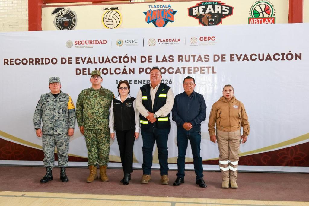 TLAXCALA, Tlax., 14 de enero de 2026.- Autoridades de los tres niveles de gobierno, encabezadas por la coordinadora nacional de Protección Civil, Laura Velázquez Alzúa, llevaron a cabo un recorrido de evaluación de rutas de evacuación en Tlaxcala, con el objetivo de verificar las condiciones de vialidad, señalética y operatividad de los refugios temporales, como parte de las acciones preventivas ante la actividad del volcán Popocatépetl.