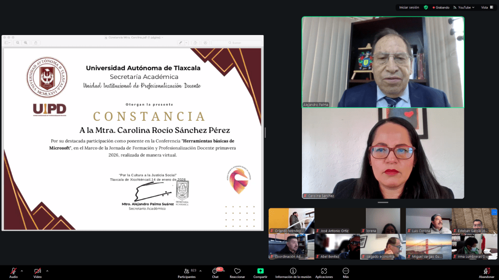 TLAXCALA, Tlax., 16 de enero de 2026.- Para optimizar y potenciar el uso de las herramientas tecnológicas que ofrece la Universidad Autónoma de Tlaxcala (UATx) a su comunidad académica, la Maestra Carolina Rocío Sánchez Pérez, Jefa de Sistemas y Tecnologías de la Información de la Secretaría Técnica, impartió la conferencia 𝐇𝐞𝐫𝐫𝐚𝐦𝐢𝐞𝐧𝐭𝐚𝐬 𝐁𝐚́𝐬𝐢𝐜𝐚𝐬 𝐝𝐞 𝐌𝐢𝐜𝐫𝐨𝐬𝐨𝐟𝐭 𝟑𝟔𝟓, como parte de la Jornada de Formación y Profesionalización Docente Primavera 2026.