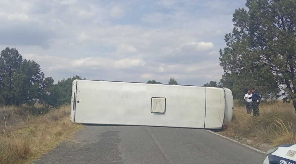 TLAXCALA, Tlax., 21 de enero de 2026.- Un microbús de transporte de personal se volcó en el tramo carretero que conecta a la comunidad de Cuaxonacayo en Ixtacuixtla con el municipio de Hueyotlipan.