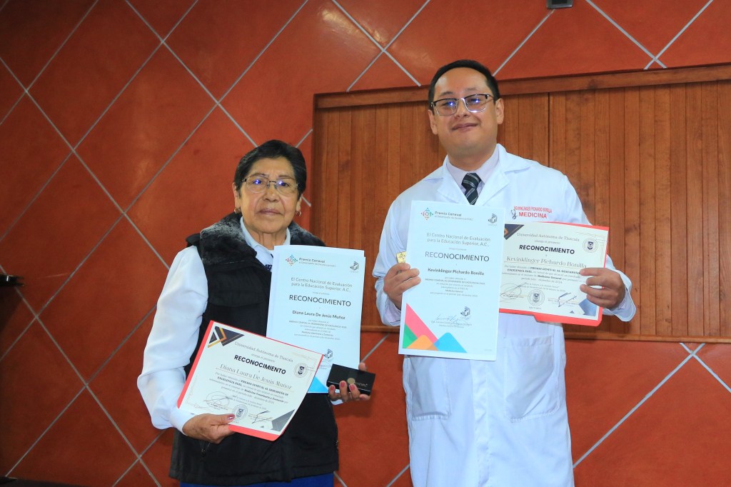 TLAXCALA, Tlax., 5 de febrero de 2026.- Kevin Klinger Pichardo Bonilla y Laura de Jesús Muñoz, estudiantes de las licenciaturas en Médico Cirujano y Medicina Veterinaria y Zootecnia de la Universidad Autónoma de Tlaxcala (UATx), recibieron el “Premio CENEVAL al Desempeño de Excelencia-EGEL” por haber obtenido un resultado sobresaliente en el examen de conocimientos aplicado en el periodo julio-diciembre 2024.