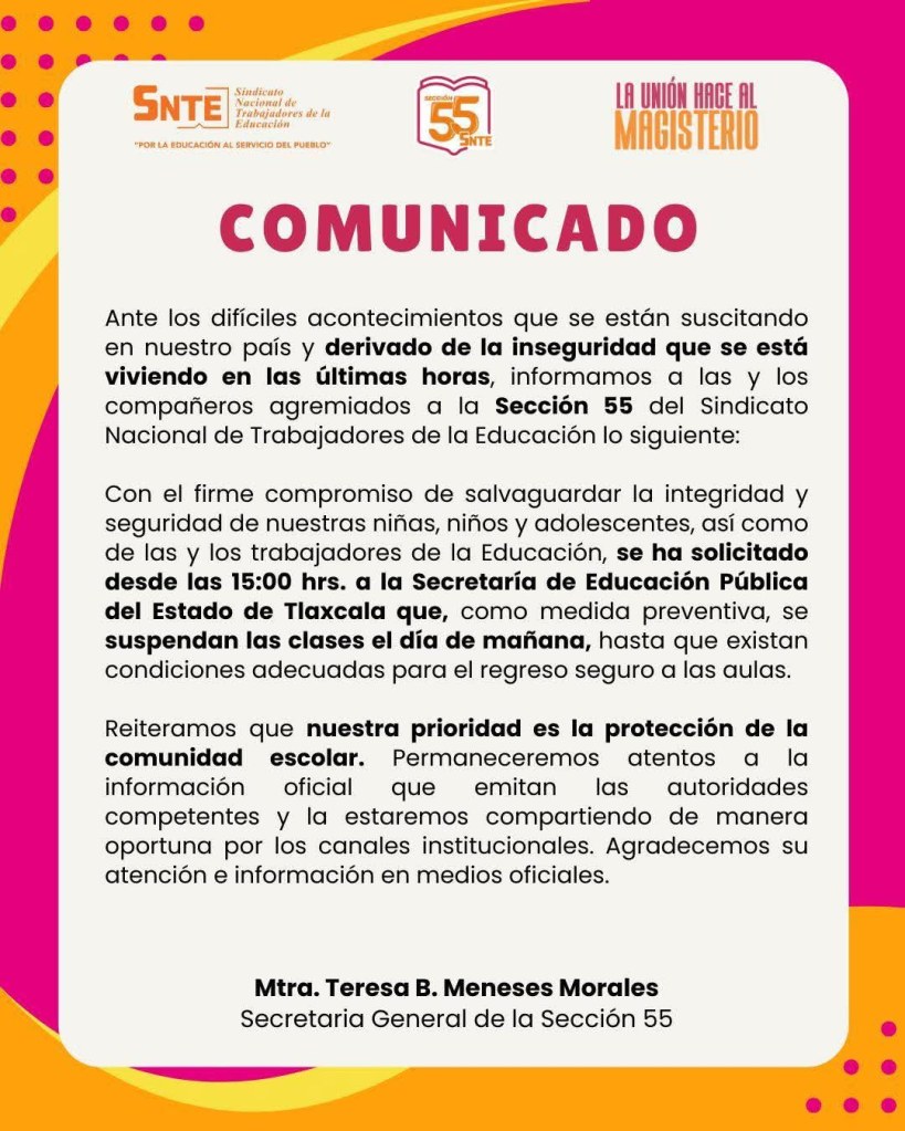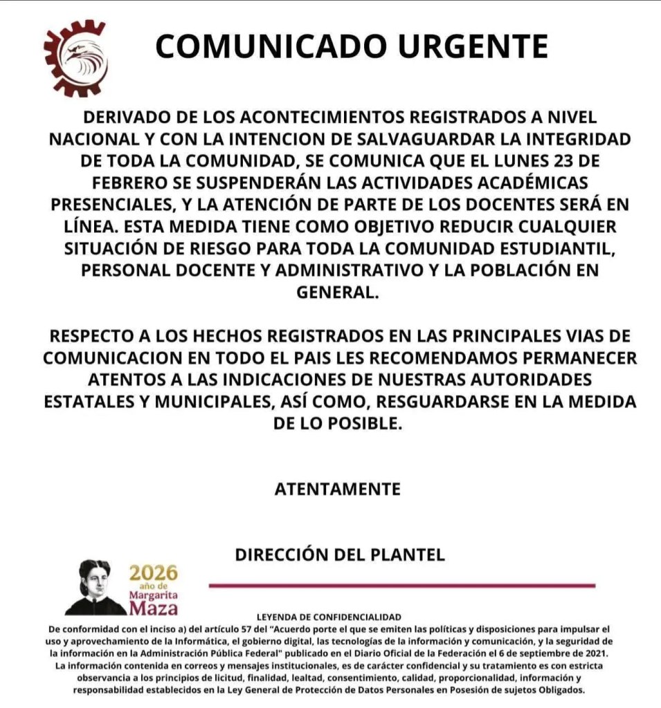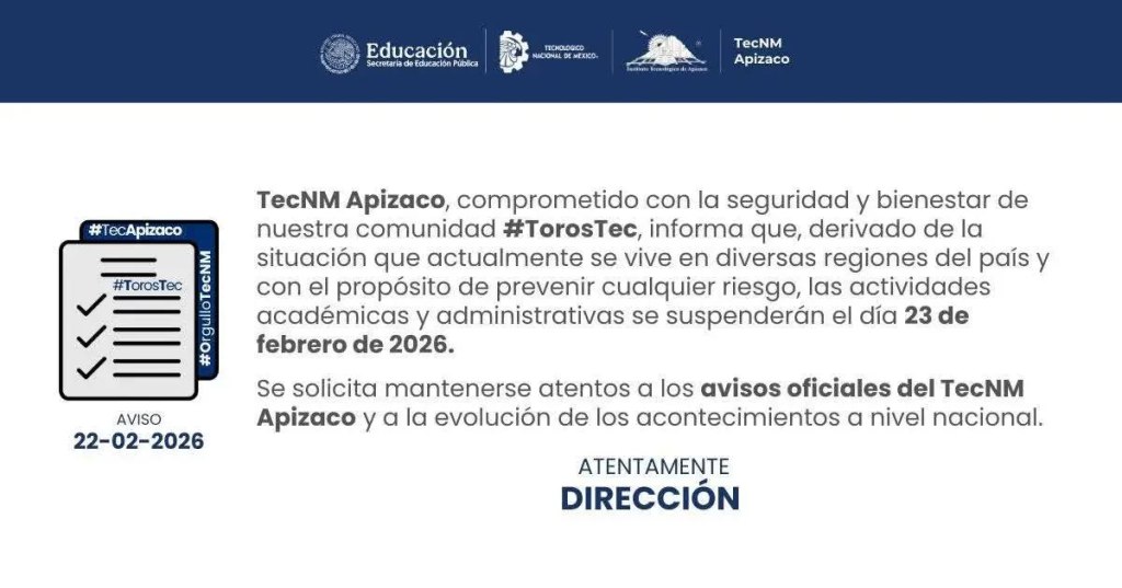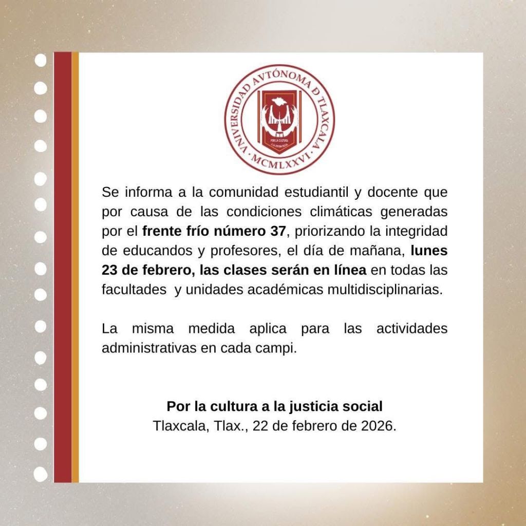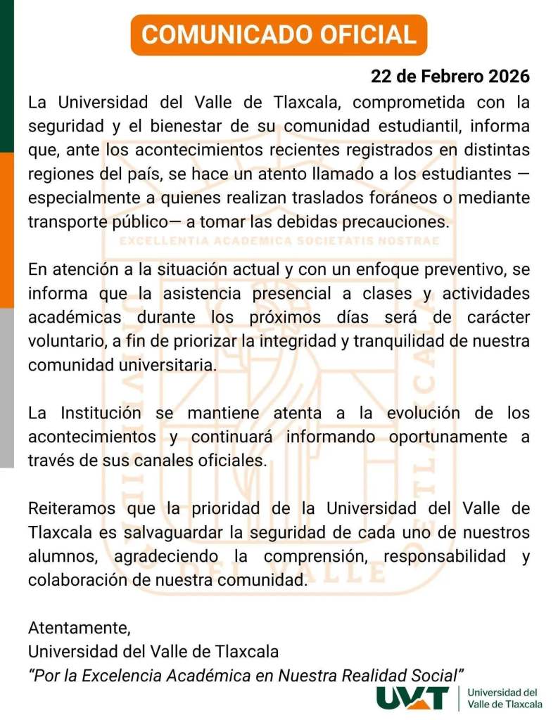 TLAXCALA, Tlax., 22 de febrero de 2026.- Las universidades en Tlaxcala desacataron la disposición oficial de la Secretaría de Educación Pública del Estado (SEPE) y anunciaron que este lunes 23 de febrero suspenderían clases y todo tipo de actividades escolares de manera presencial, para salvaguardar la integridad de su comunidad estudiantil.