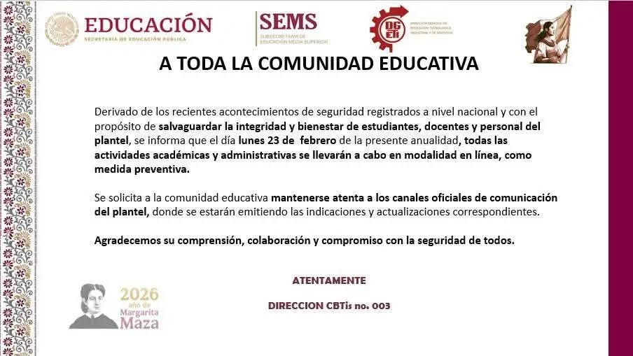A esta iniciativa, se sumaron la Sección 55 del Sindicato Nacional de Trabajadores de la Educación (SNTE) y la Dirección General del Centro de Bachillerato Tecnológico e Industrial (CBTIS) perteneciente el Sistema de Educación Media Superior (SEMS), quienes informaron que sus clases se realizarían en línea y no de manera presencial.