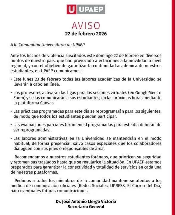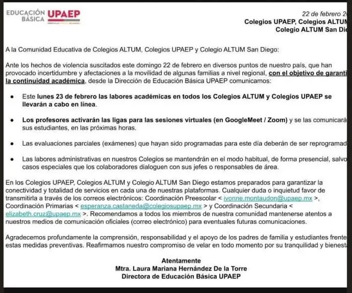 Estas instituciones, dieron a conocer que derivado de la inseguridad que privó este domingo el país, se informaba a la comunidad en general la suspensión de actividades escolares este 23 de febrero, por lo que se invitaba a los padres de familia y trabajadores de este sector a salvaguardar su integridad y la de sus hijos.