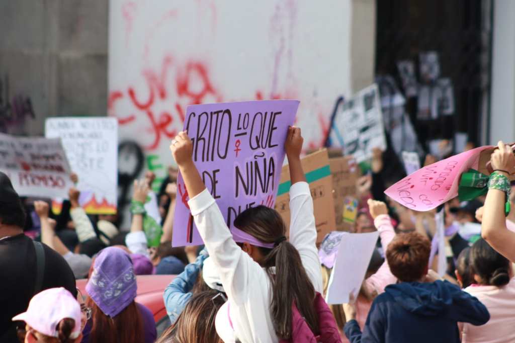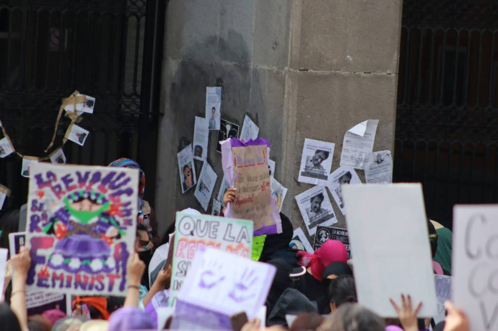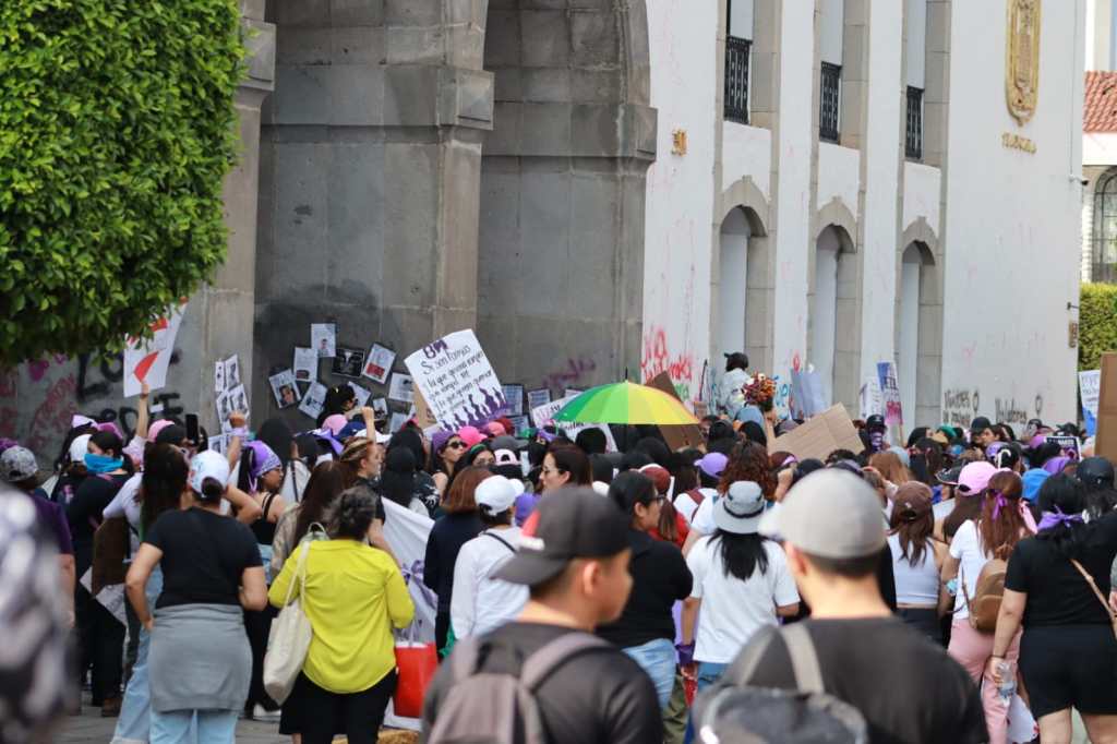 Posteriormente, este contingente se concentró en la Plaza de la Constitución donde pintaron consignas en las vallas metálicas y colocaron cartulinas y mensajes contra violentadores, agresores sexuales y deudores alimentarios.