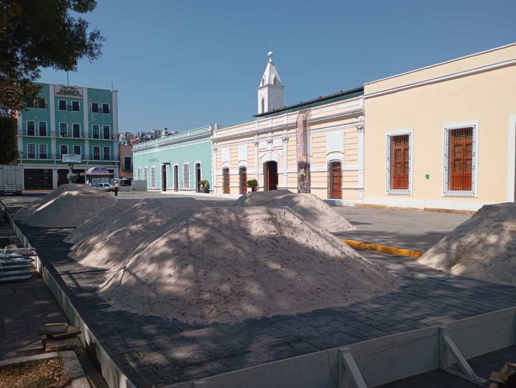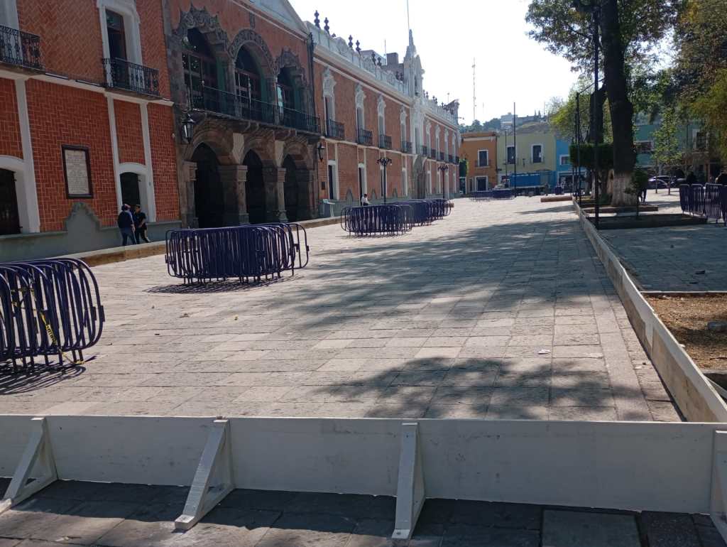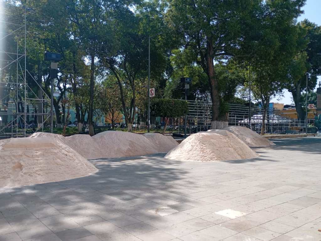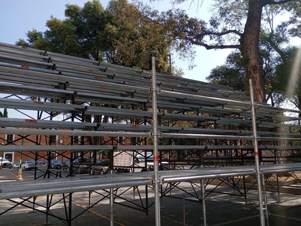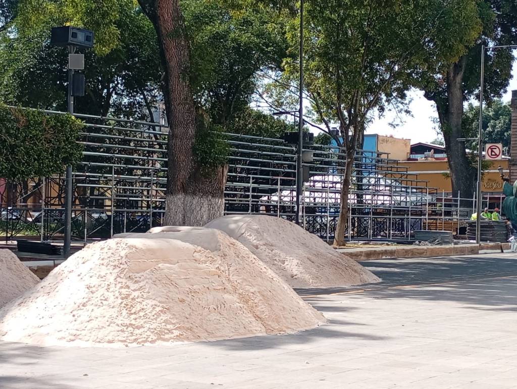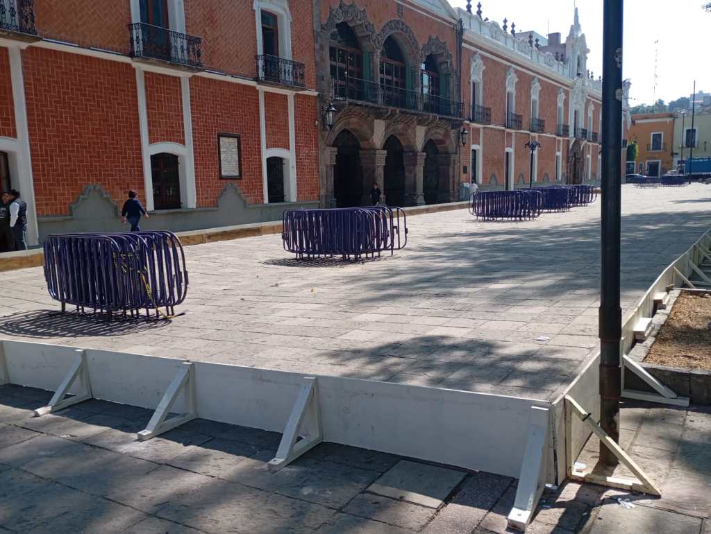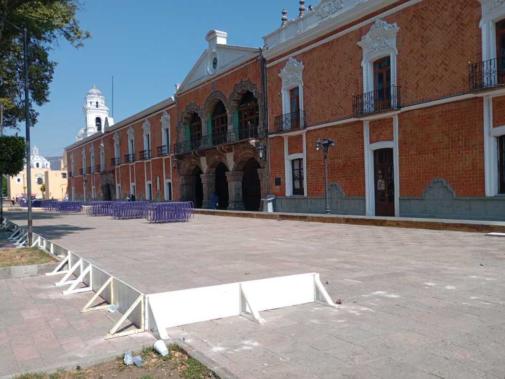 De igual manera, frente al Museo de Arte de Tlaxcala (MAT) y al Palacio de Gobierno ya se instalan las gradas y zona de las canchas, por lo que se ha comenzado con el traslado de las vallas metálicas y estructuras de las gradas.