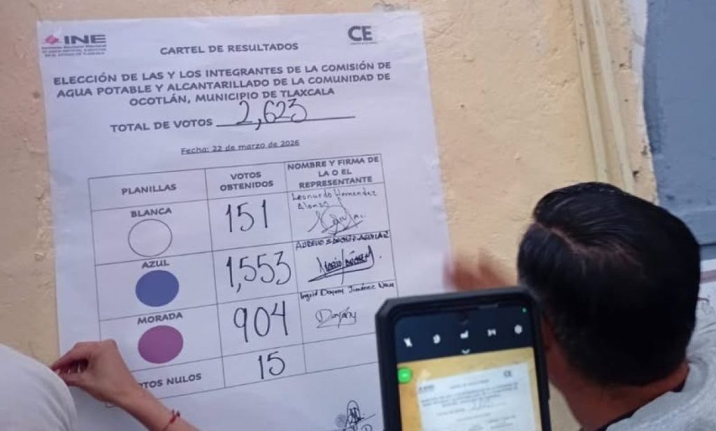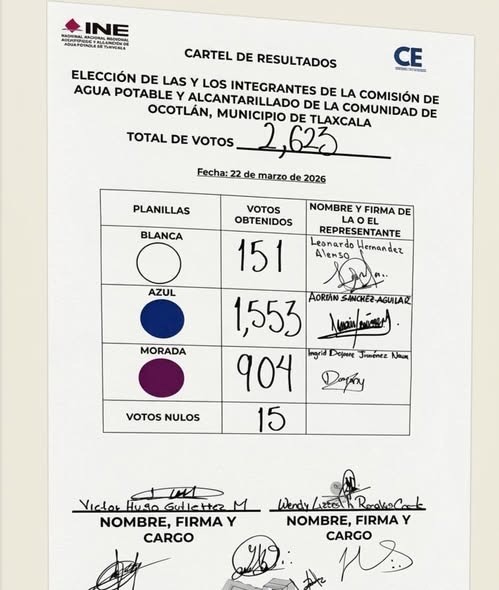 TLAXCALA, Tlax., 22 de marzo de 2026.- Víctor Garrido abanderado de la planilla Azul logró retener la titularidad de la Comisión del Agua Potable y Alcantarillado de la comunidad de Ocotlán (CAPAO), frente a sus adversarios que eran apoyados por la maquinaria oficial del alcalde Alfonso Sánchez García.
