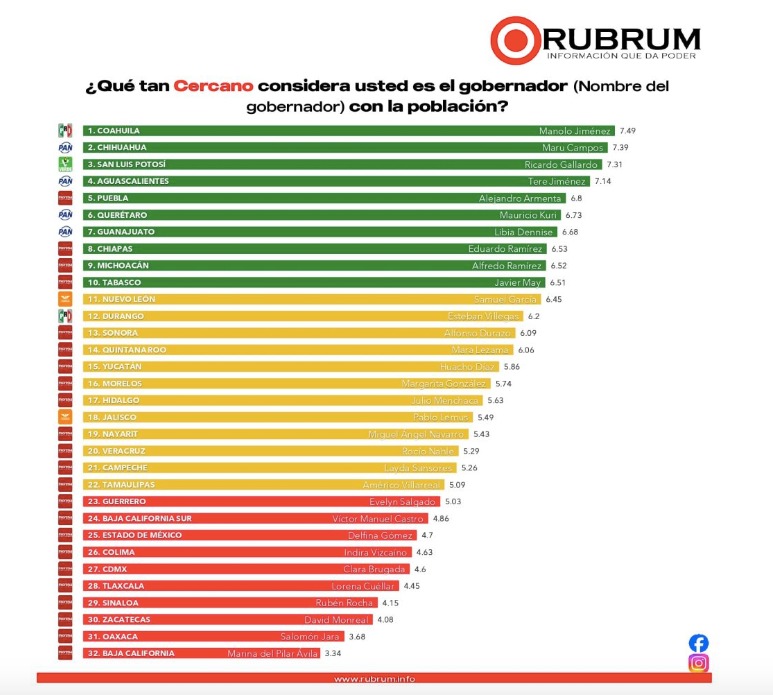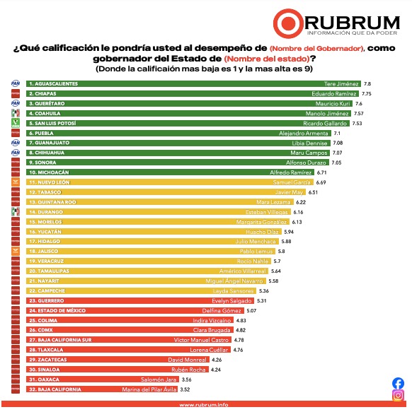 En cuanto a los gobernadores mejor evaluados,Tere Jiménez de Aguascalientes con 7.8 puntos de calificación; Eduardo Ramírez de Chiapas con 7.75 puntos; Mauricio Kuri de Querétaro con 7.6 puntos; Manolo Jiménez de Coahuila con 7.57 puntos y Ricardo Gallardo de San Luis Potosí con 7.53 puntos.