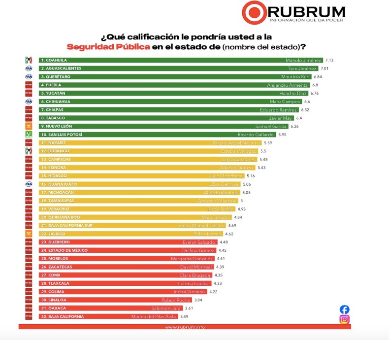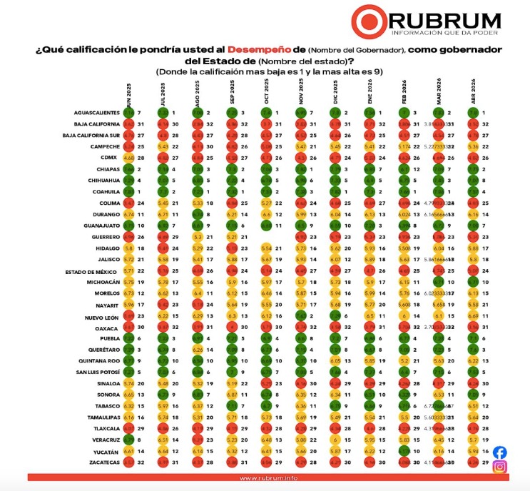 De acuerdo al estudio del 24 al 27 de marzo de este año y publicado en los primeros días de este mes de abril, la mandataria estatal ocupa el lugar 28 en el ranking a nivel nacional en cuanto a su desempeño, sin embargo, esta calificación reprobatoria la ha arrastrado desde el mes de abril de 2025 a la actualidad, lo que significa calificaciones apenas arriba de cuatro puntos, sin alcanzar el número cinco y que determina reprobación de sus gobernados.