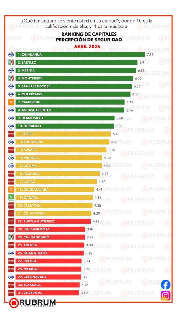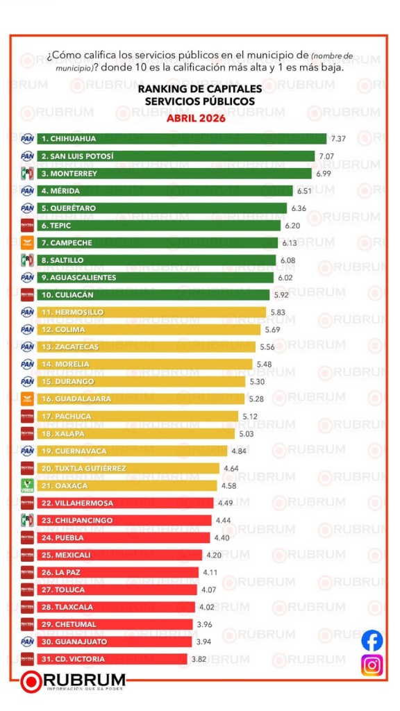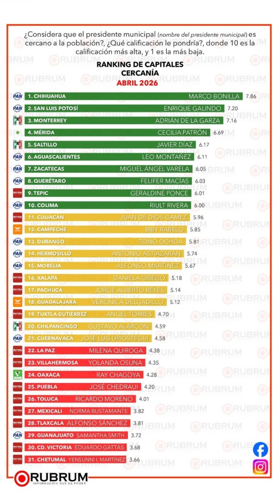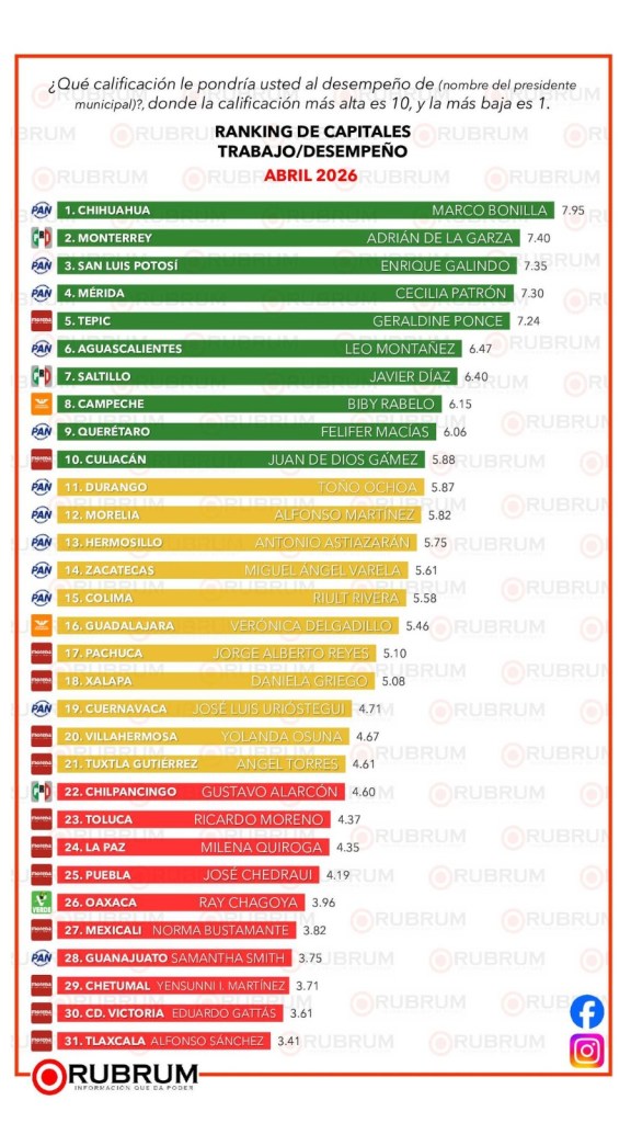 Esta encuesta fue realizada por la empresa demoscópica Rubrum vía telefónica y de forma aleatoria, en un universo de 600 personas encuestadas en cada una de las 31 capitales del país, el levantamiento de información fue realizado del 6 al 11 de abril de 2026.