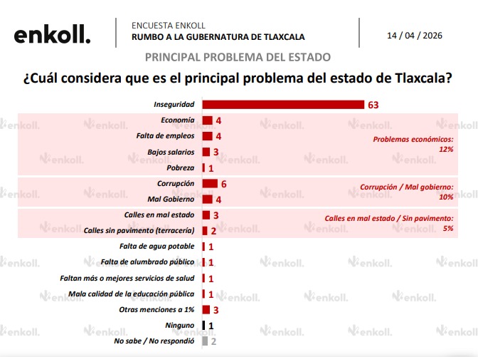 Si bien, el 63 por ciento de los mil 223 encuestados por la empresa demoscópica Enkoll indica que el mayor problema en Tlaxcala es la inseguridad; el 12 por ciento refiere que el estado presenta problemas económicos derivados de la falta de empleos, bajos salarios y pobreza; el 10 por ciento lo atribuye a la corrupción y el mal gobierno y el 5 por ciento, reclama la falta de obra pública, mientras que el restante reclama falta de agua potable, deficiencia y escases de alumbrado público, falta de servicios de salud, mala calidad de la educación pública, entre otros temas.
