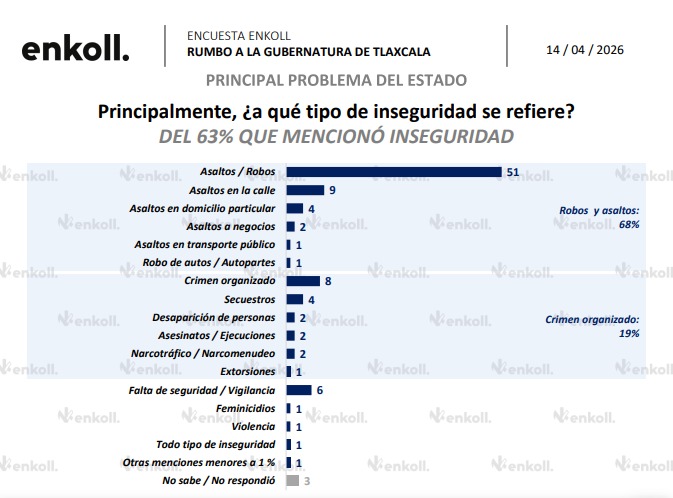 TLAXCALA, Tlax., 19 de abril de 2026.- El estado de Tlaxcala enfrenta una crisis de seguridad que no ha podido controlar, esto de acuerdo al más reciente estudio de Enkoll, publicado por el periódico El Universal el pasado 14 de abril, donde el 63 por ciento de los tlaxcaltecas refieren sentirse inseguros y vulnerables ante la violencia, robo, falta de vigilancia y la presencia del crimen organizado.
