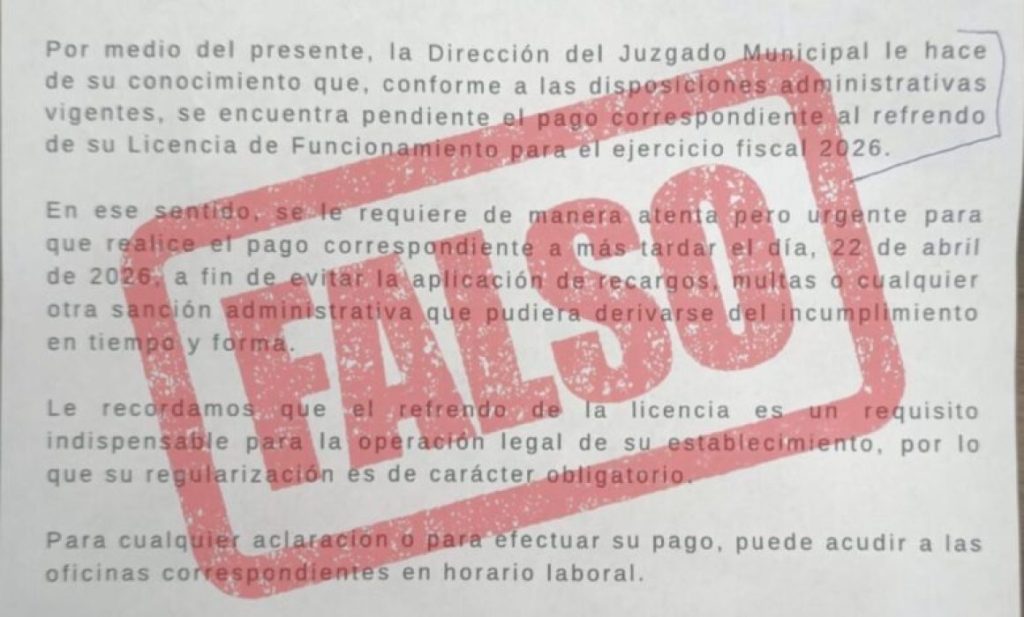 Esta semana, falsos servidores municipales se presentaron en distintos establecimientos comerciales con un falso oficio DMJ/045/2026, supuestamente emitido por la Dirección del Juzgado Municipal, donde requerían el pago de refrendo de licencia de funcionamiento 2026, con el argumento que se encontraba pendiente este cumplimiento.